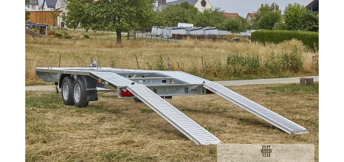 Durch robustes Fahrwerk ('-) und verstärkte Achsen ist der Autotransporter Martz GT Plus 450 4520 x 2050 cm 3000 Kg ideal für Baustellen und Dauereinsatz.